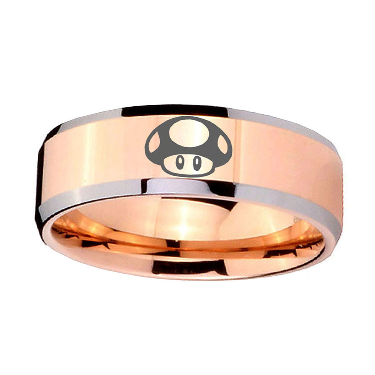 10mm Mario Mushroom Beveled Edges Rose Gold Tungsten Mens Ring Personalized