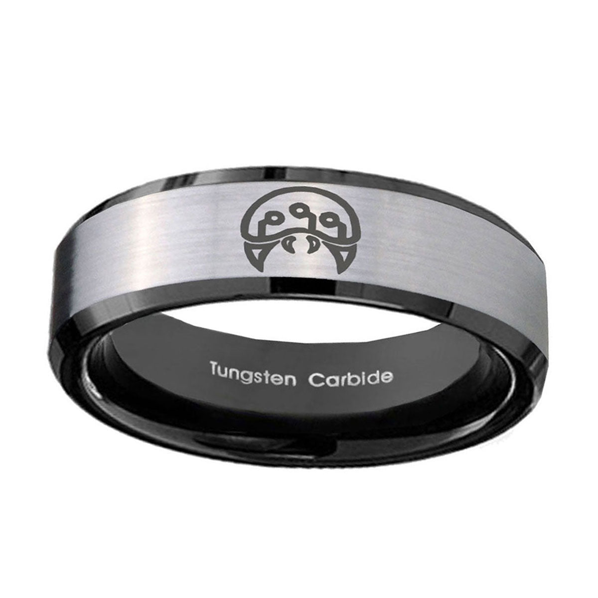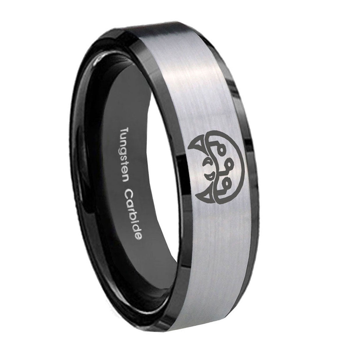 Make a promise with the 10mm Metroid Beveled Edges Brushed Silver Black Tungsten Mens Promise Ring. This silver and black tungsten ring with Metroid design is ideal for commitments.