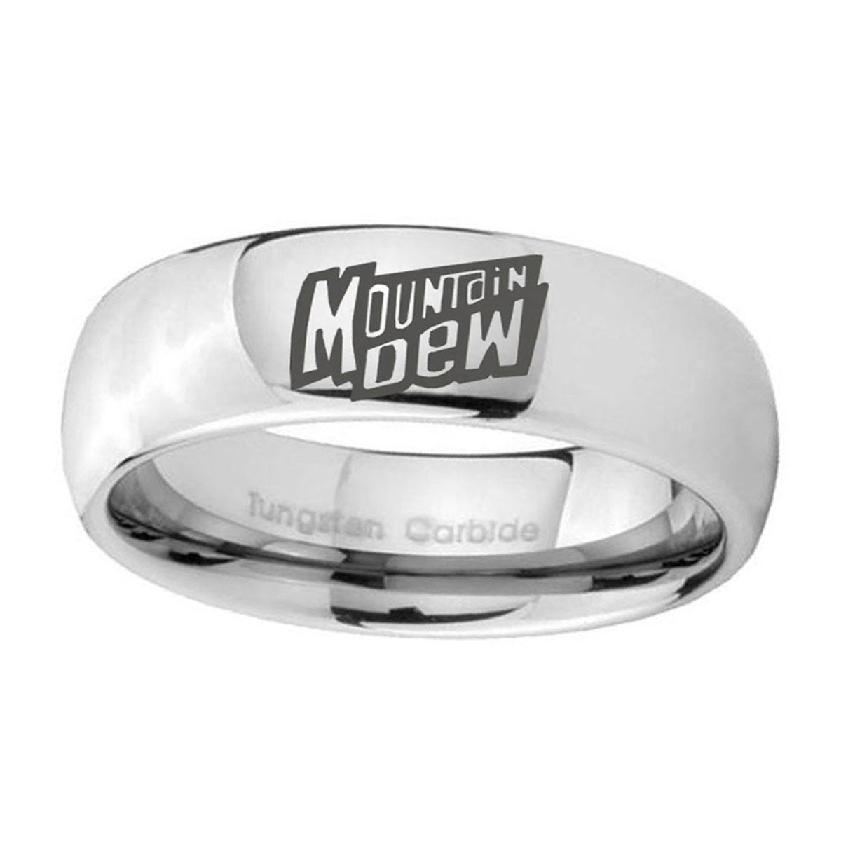 Style the 10mm Mountain Dew Mirror Dome Tungsten Carbide Mens Bands Ring. This polished mirror dome ring with Mountain Dew design is perfect for men.