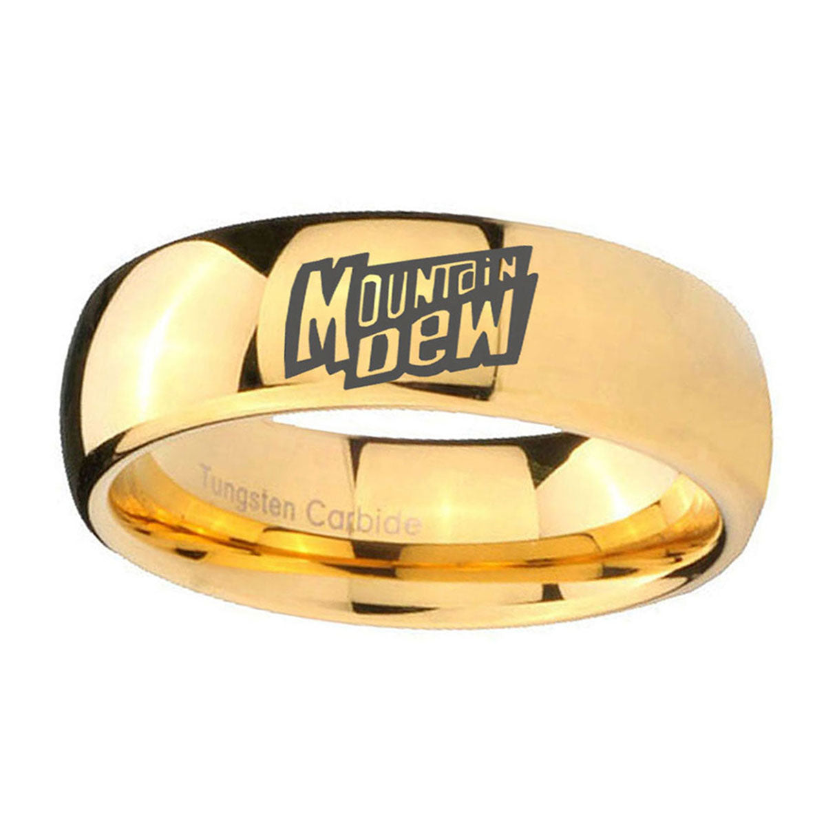 Celebrate with the 10mm Mountain Dew Dome Gold Tungsten Carbide Mens Wedding Ring. This gold-finished tungsten ring with Mountain Dew design is perfect for weddings.