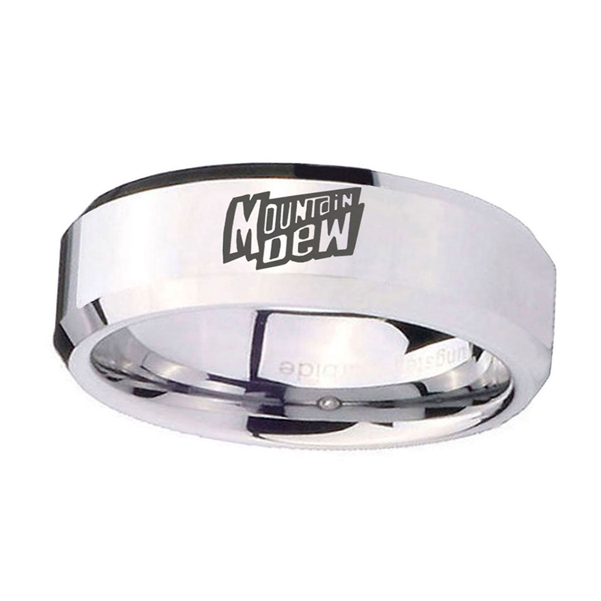 Celebrate with the 10mm Mountain Dew Beveled Edges Silver Tungsten Carbide Wedding Band Mens. This silver tungsten ring with Mountain Dew design is perfect for weddings.