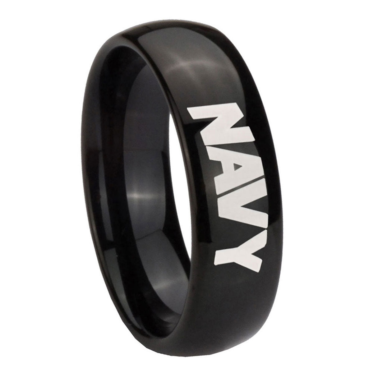 Propose with the 10mm Navy Dome Black Tungsten Carbide Wedding Engagement Ring. This dome-shaped black tungsten ring with Navy design is ideal for engagements.