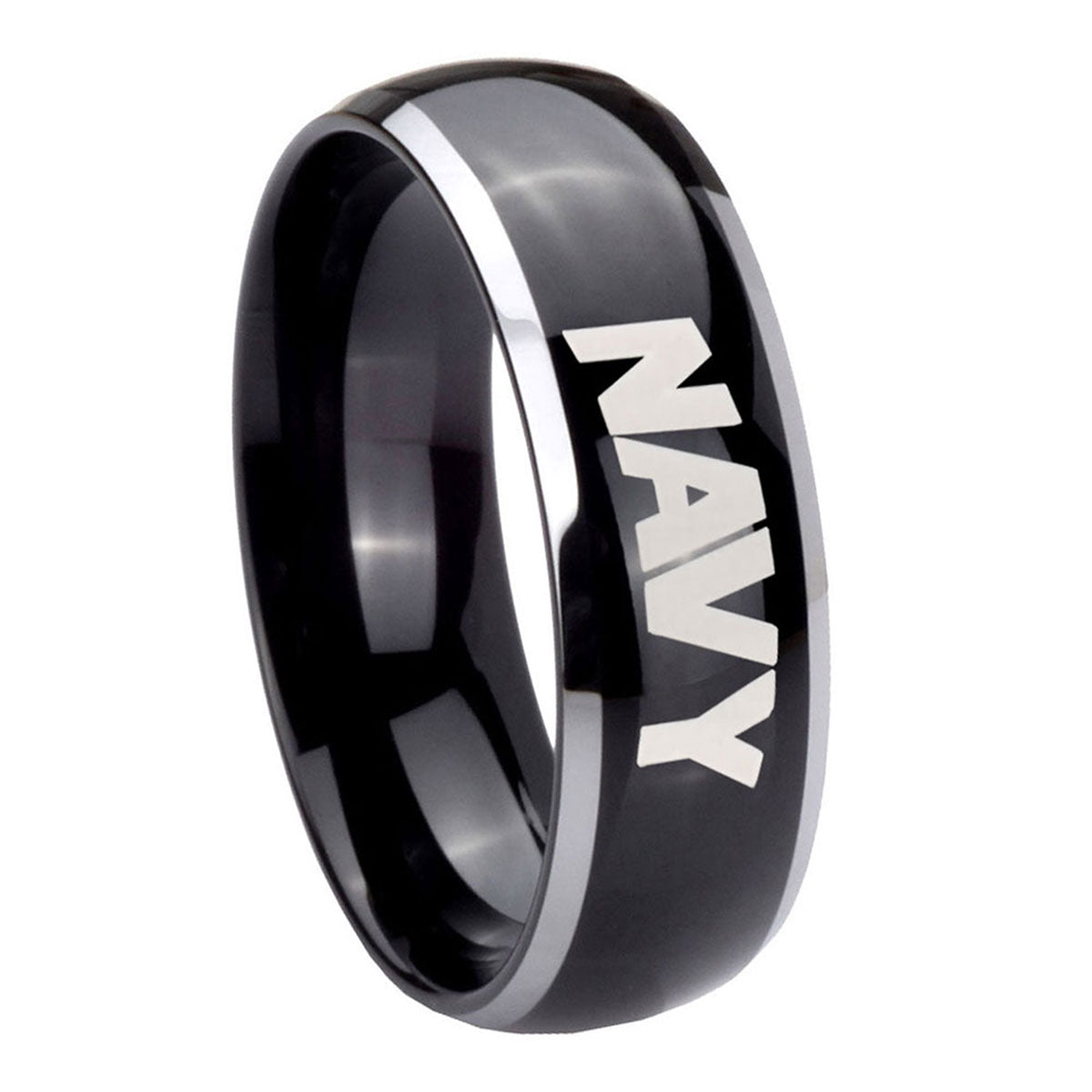 Propose with the 10mm Navy Dome Glossy Black 2 Tone Tungsten Carbide Men's Engagement Ring. This glossy black and 2-tone dome ring with Navy design is ideal for engagements.