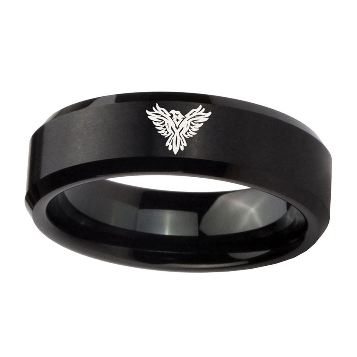Propose with the 10mm Phoenix Beveled Edges Brush Black Tungsten Carbide Mens Engagement Band. This brushed black tungsten ring with Phoenix design is ideal for engagements.