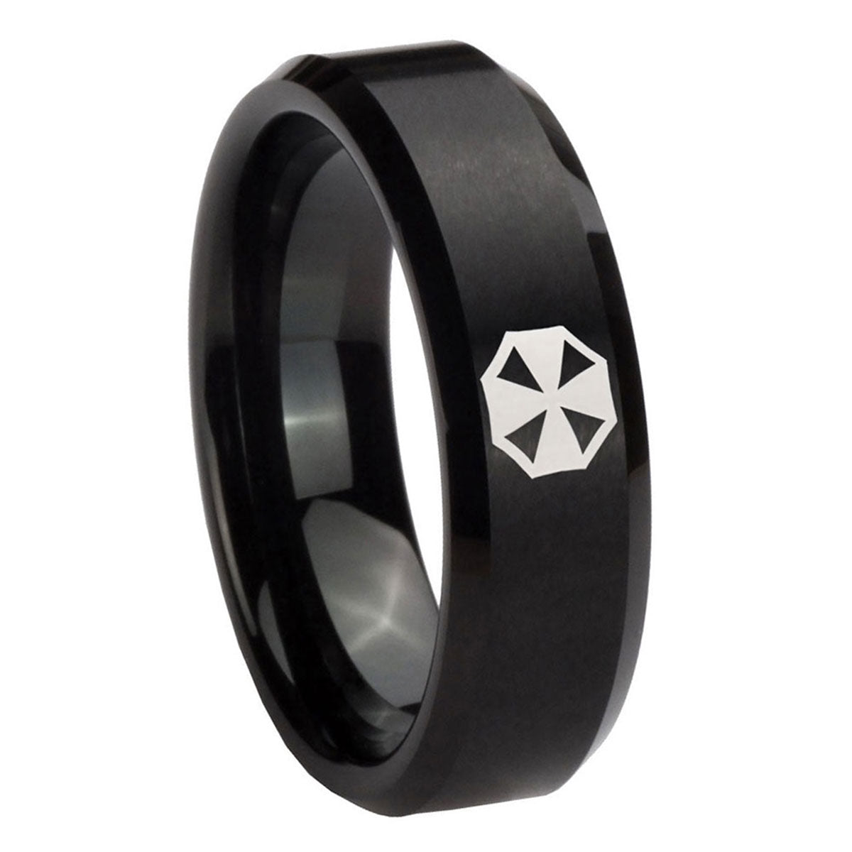 Propose with the 10mm Resident Evil Beveled Edges Brush Black Tungsten Men's Engagement Ring. This brushed black tungsten ring with Resident Evil design is ideal for engagements.