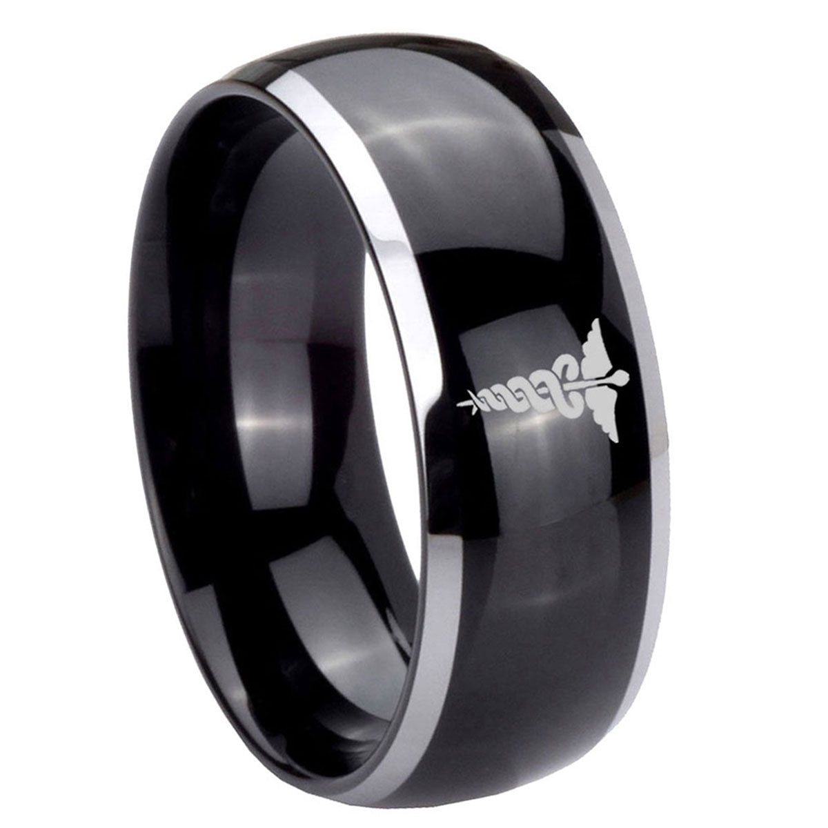 10mm Medical Symbol Dome Glossy Black 2 Tone Tungsten Carbide Engraved Ring