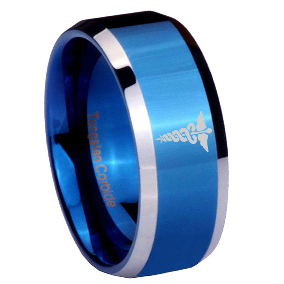 10mm Medical Symbol Beveled Edges Blue 2 Tone Tungsten Men's Engagement Ring