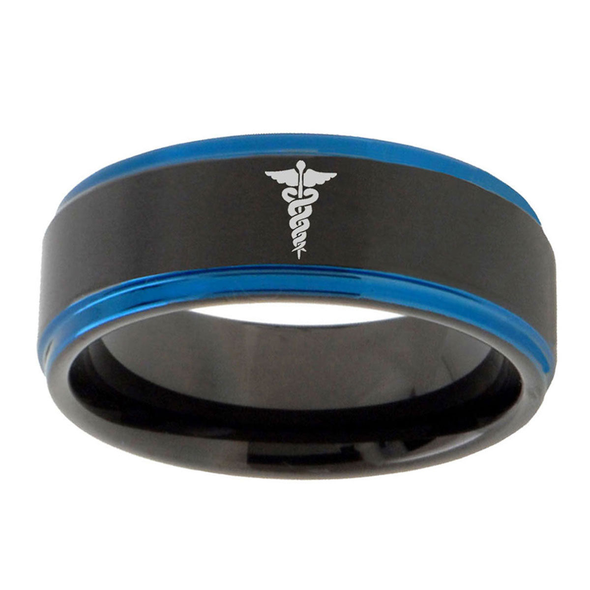 Make a promise with the 10mm Medical Symbol Blue Step Edges Brushed Tungsten Carbide Mens Promise Ring. This brushed blue tungsten ring with Medical Symbol design is ideal for commitments.