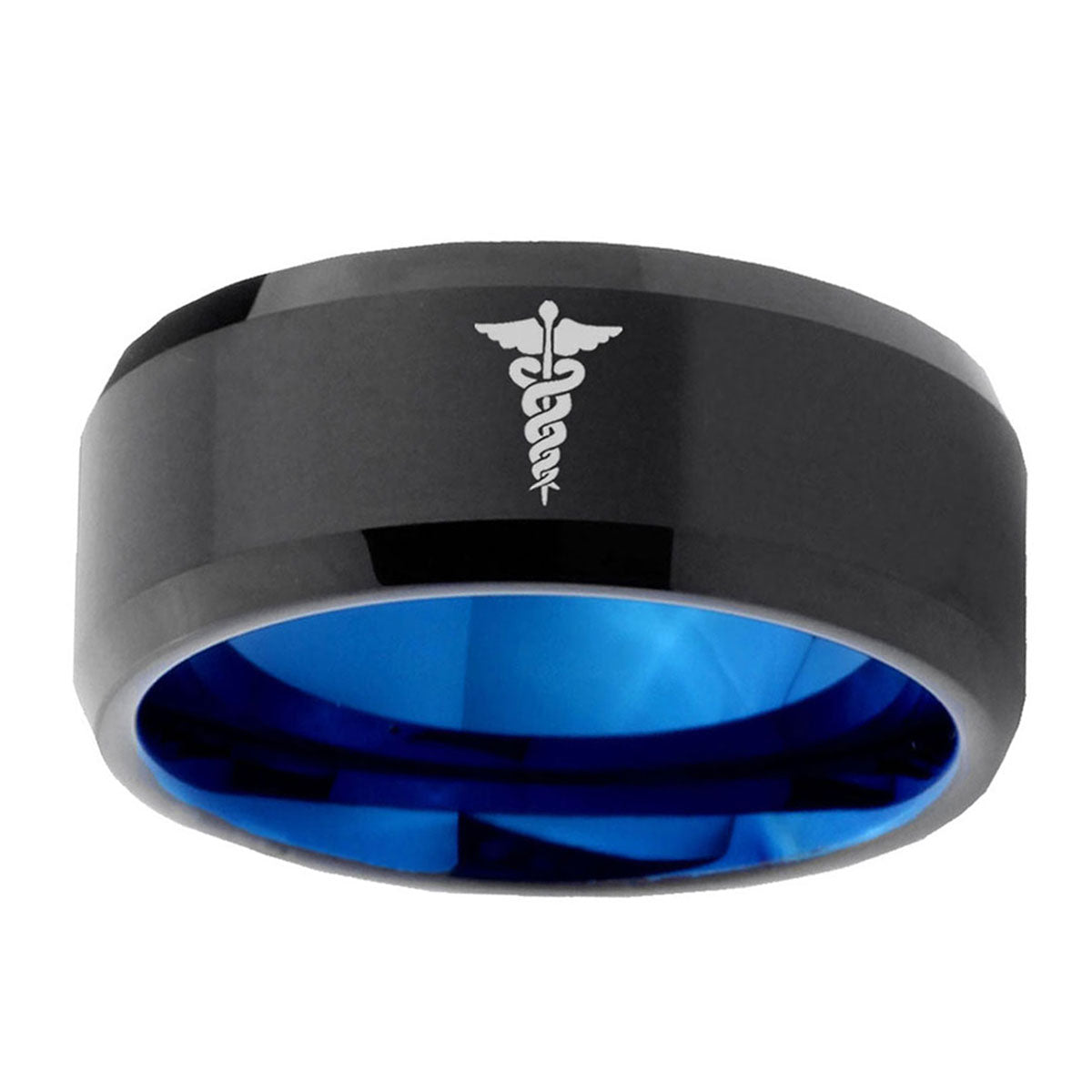 Celebrate with the 10mm Medical Symbol Bevel Tungsten Carbide Blue Wedding Ring. This blue tungsten ring with Medical Symbol design is perfect for weddings.