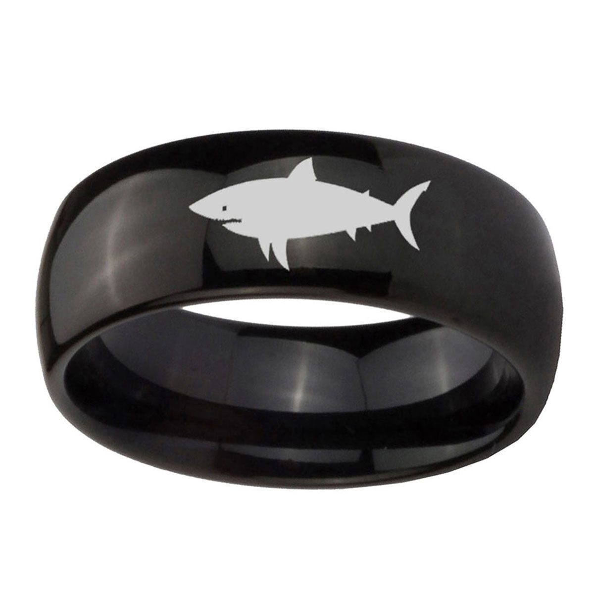 Celebrate milestones with the 10mm Shark Dome Black Tungsten Carbide Mens Anniversary Ring. This dome-shaped black tungsten ring with Shark design is perfect for anniversaries.