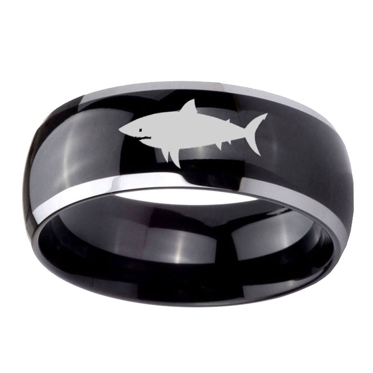 Personalize the 10mm Shark Dome Glossy Black 2 Tone Tungsten Carbide Engraved Ring. This glossy black and 2-tone dome ring with Shark design is perfect for custom engravings.