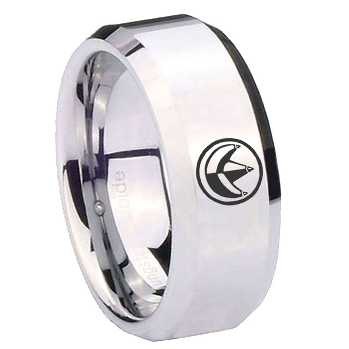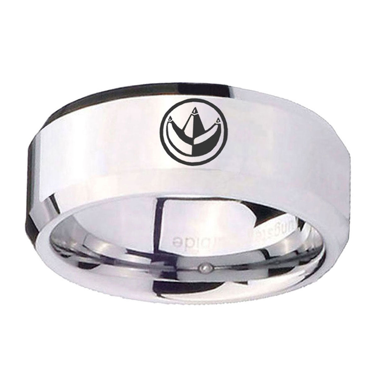 Personalize the 10mm Green Ranger Power Beveled Edges Silver Tungsten Carbide Mens Ring Engraved. This silver tungsten ring with Green Ranger Power design is perfect for custom engravings.