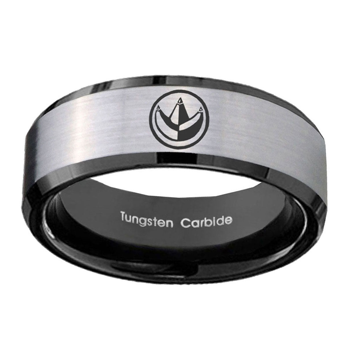 Customize the 10mm Green Ranger Power Beveled Brushed Silver Black Tungsten Custom Mens Ring. This silver and black tungsten ring with Green Ranger Power design is ideal for personalization.
