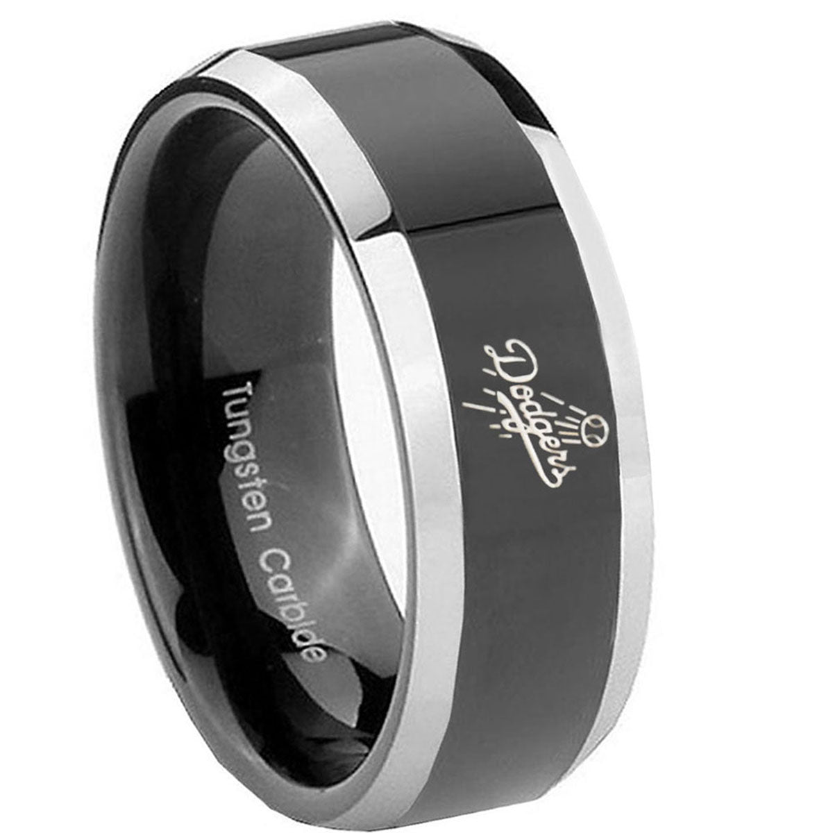 Personalize the 10mm LA Dogers MLB Baseball Beveled Glossy Black 2 Tone Tungsten Engraved Ring. This glossy black and 2-tone tungsten ring with LA Dogers design is perfect for custom engravings.