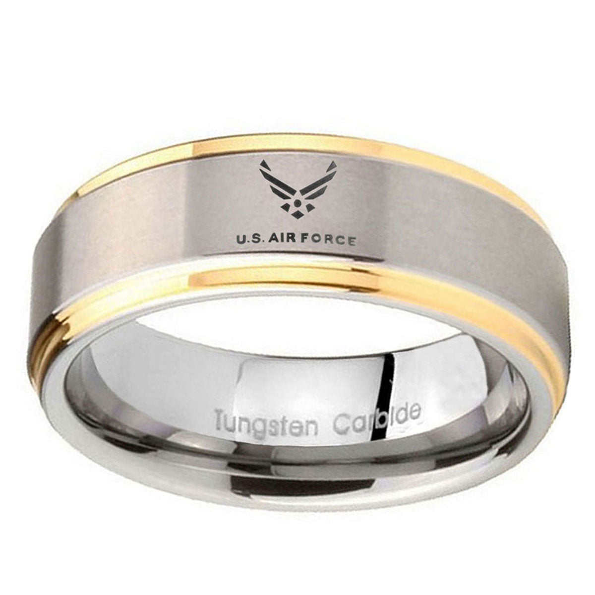 Style the 10mm Step Edges US Air Force 14K Gold IP Tungsten Two Tone Men's Ring. This gold and two-tone tungsten ring with US Air Force design is perfect for men.