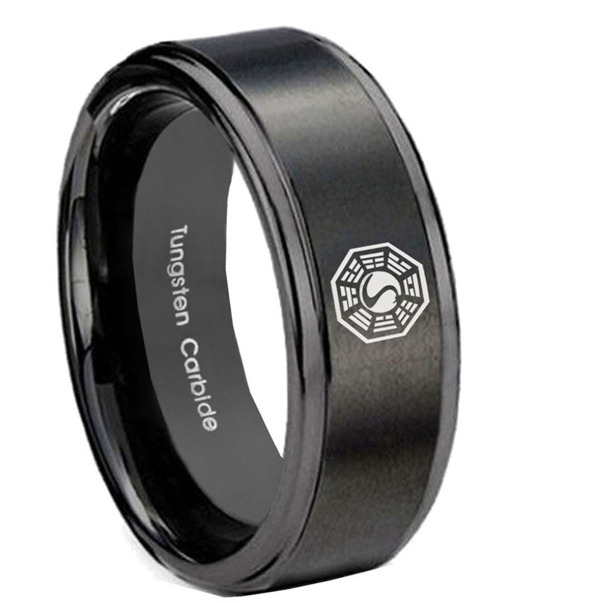 Propose with the 10mm Lost Dharma Step Edges Brush Black Tungsten Wedding Engagement Ring. This brushed black ring with step edges and Lost Dharma design is ideal for engagements.