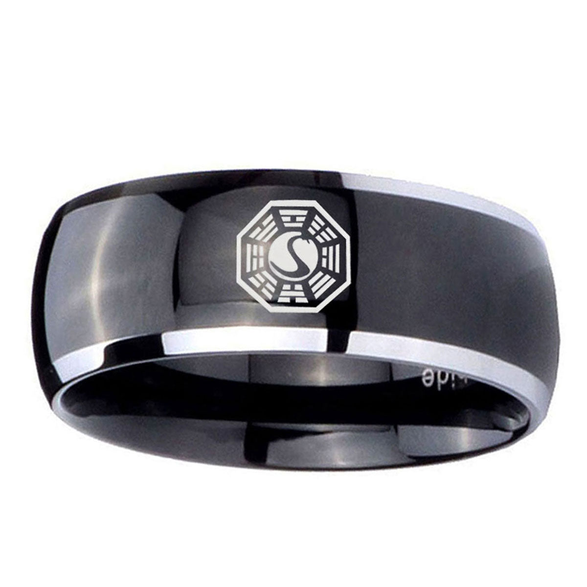 Personalize the 10mm Lost Dharma Dome Glossy Black 2 Tone Tungsten Carbide Personalized Ring. This glossy black and 2-tone dome ring with Lost Dharma design is perfect for custom engravings.
