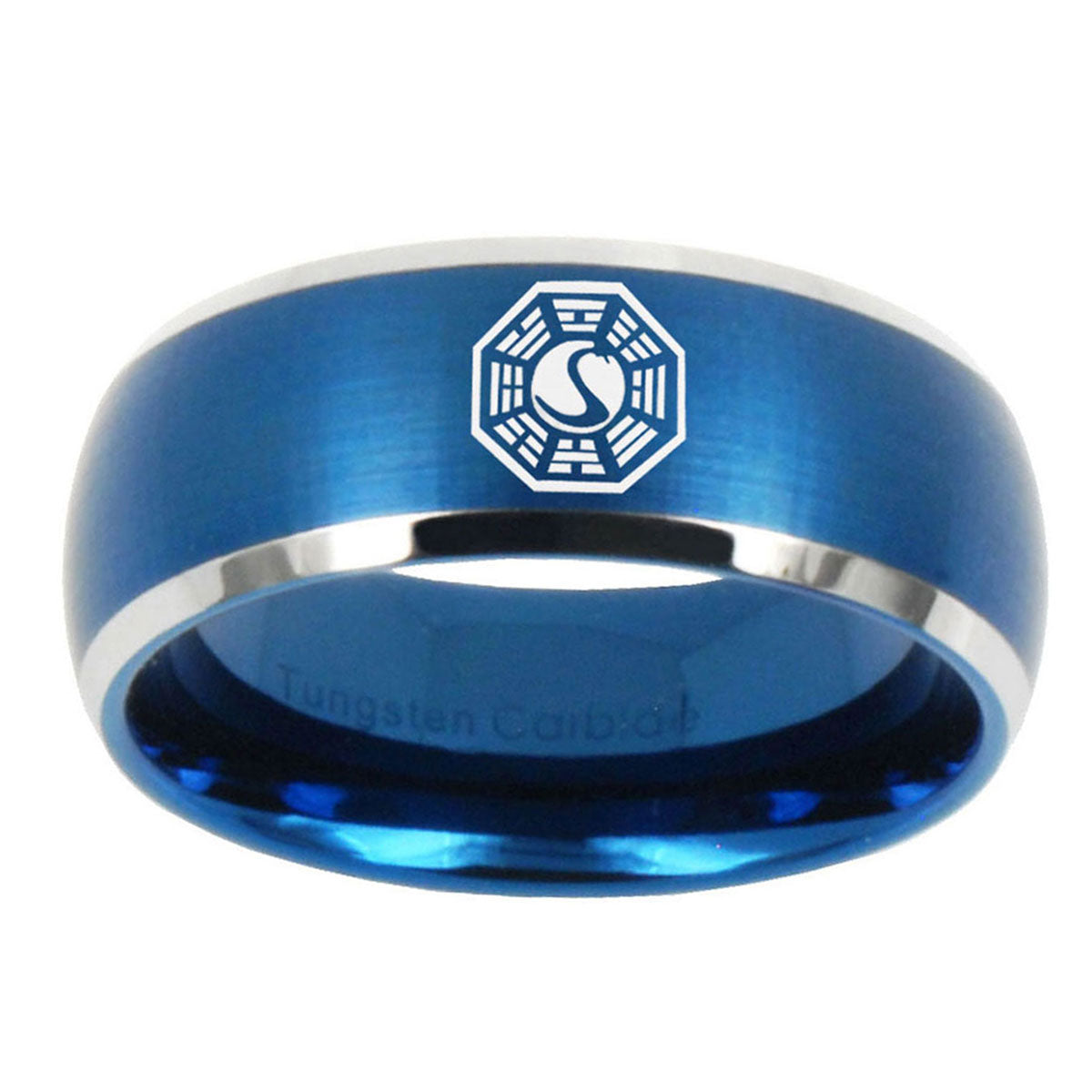 Style the 10mm Lost Dharma Dome Brushed Blue 2 Tone Tungsten Carbide Men's Band Ring. This blue and black 2-tone dome ring with Lost Dharma design is perfect for men.