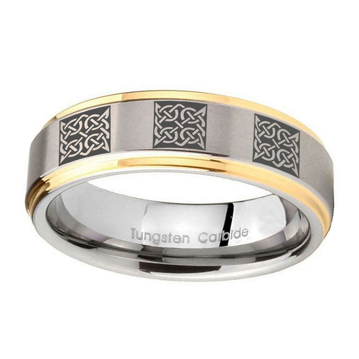 Propose with the 10mm Multiple Celtic Step Edges Gold 2 Tone Tungsten Men's Engagement Ring. This gold and 2-tone tungsten ring with Multiple Celtic design is ideal for engagements.