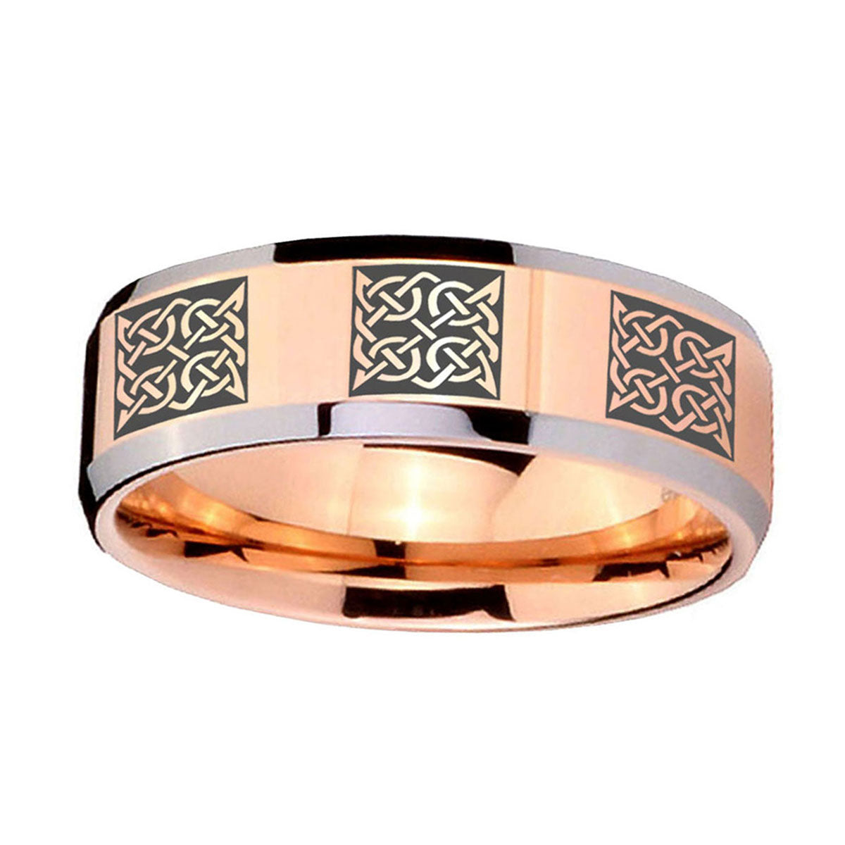 Make a promise with the 10mm Multiple Celtic Beveled Edges Rose Gold Tungsten Men's Promise Rings. This rose gold tungsten ring with Multiple Celtic design is ideal for commitments.