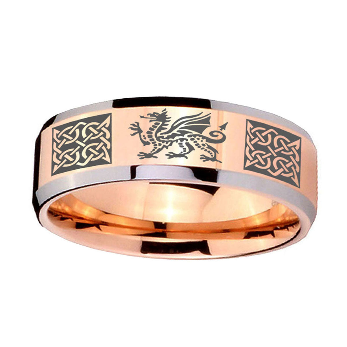 10mm Multiple Dragon Celtic Beveled Edges Rose Gold Tungsten Custom Mens Ring