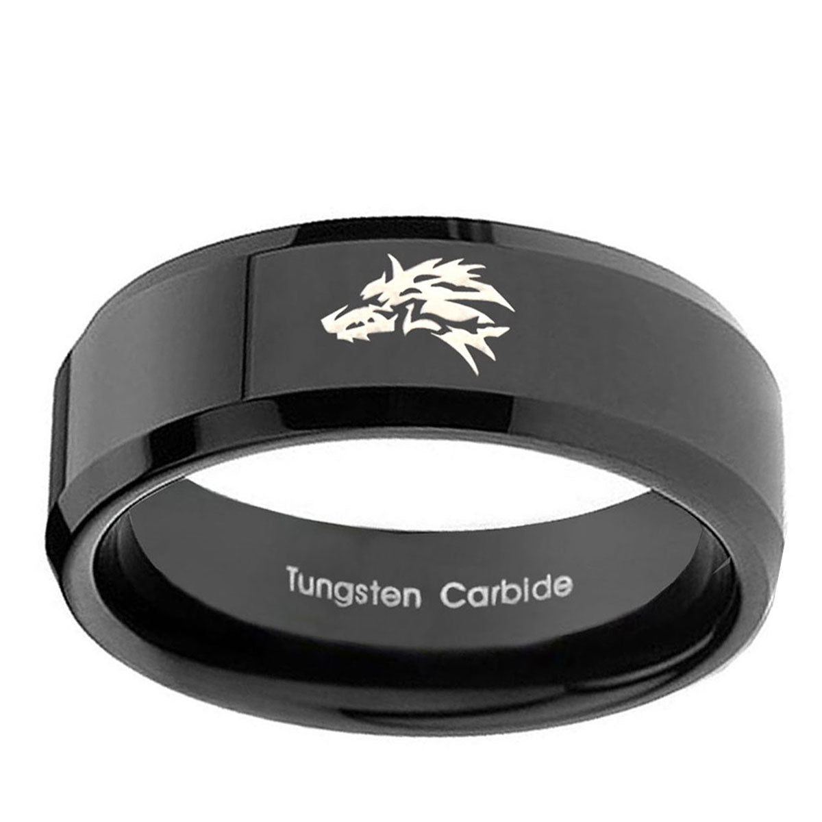 Celebrate with the 10mm Wolf Beveled Edges Black Tungsten Carbide Mens Wedding Band. This black tungsten ring with Wolf design is perfect for weddings.