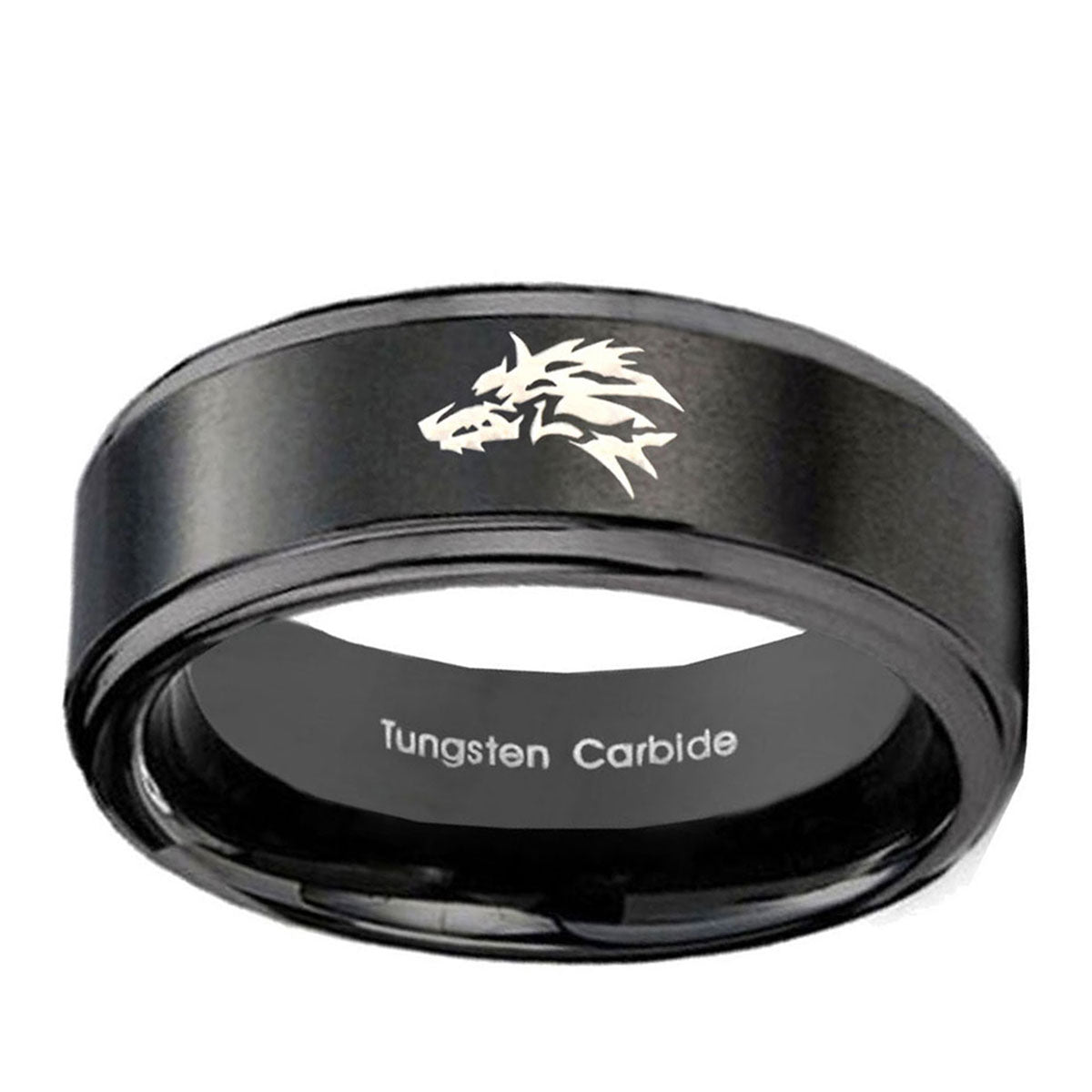 Propose with the 10mm Wolf Step Edges Brush Black Tungsten Carbide Engagement Ring. This brushed black ring with step edges and Wolf design is ideal for engagements.