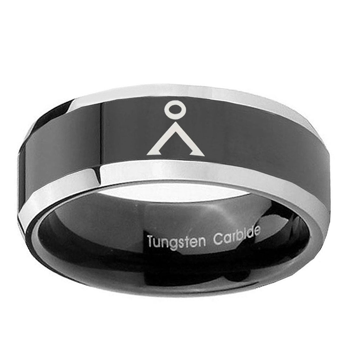 Style the 10mm Stargate Beveled Edges Glossy Black 2 Tone Tungsten Carbide Rings for Men. This glossy black and 2-tone tungsten ring with Stargate design is perfect for men.