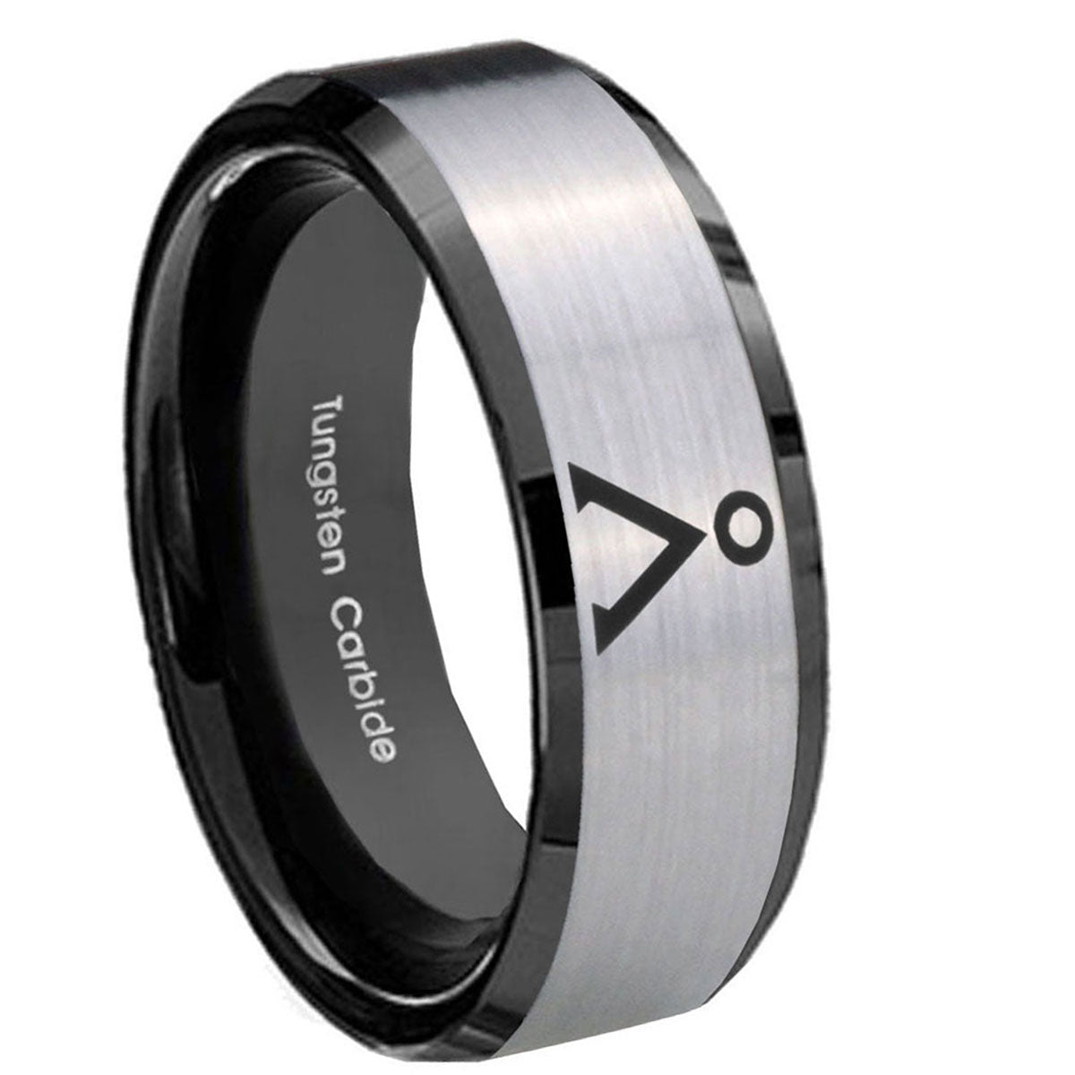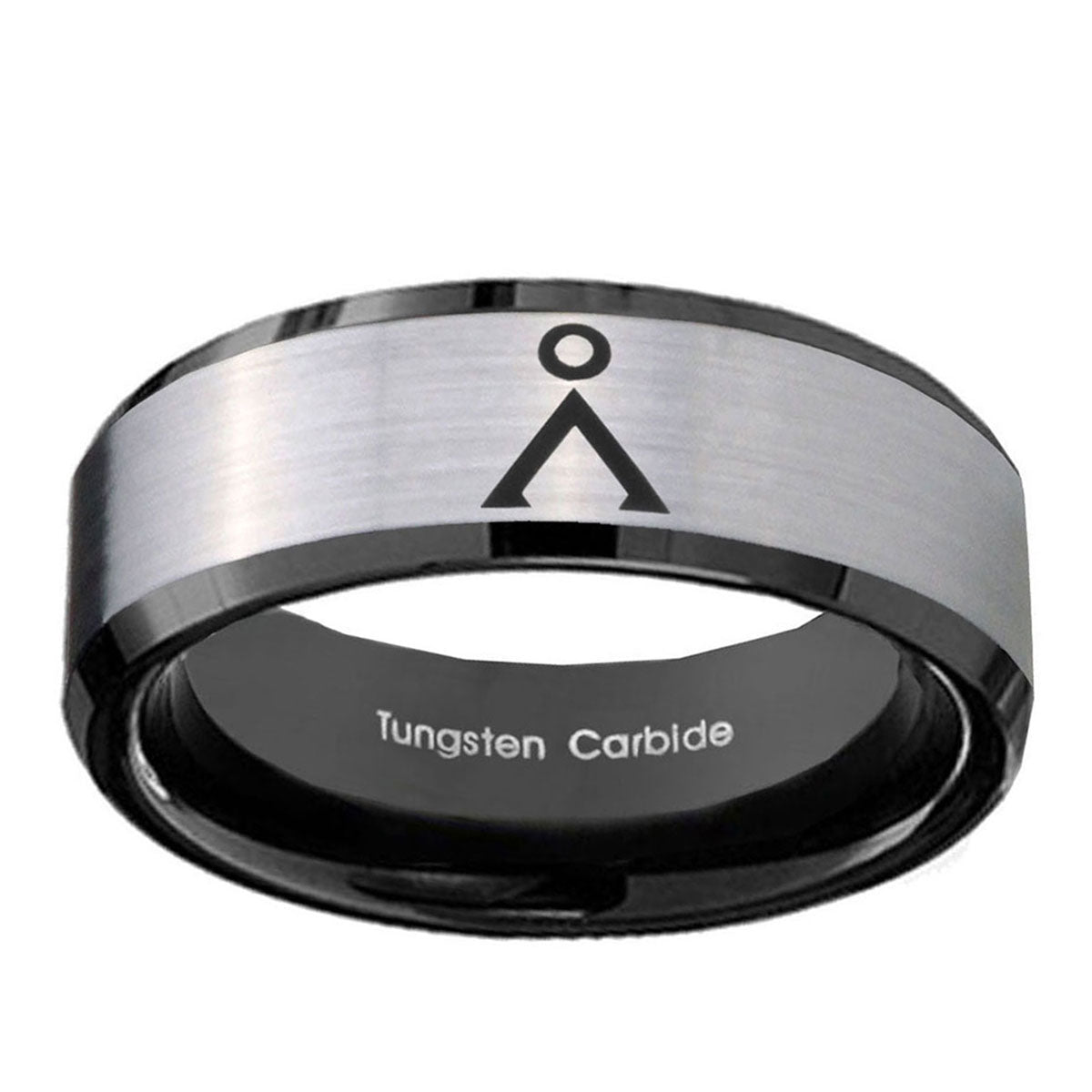 Propose with the 10mm Stargate Beveled Edges Brushed Silver Black Tungsten Engagement Ring. This silver and black tungsten ring with Stargate design is ideal for engagements.