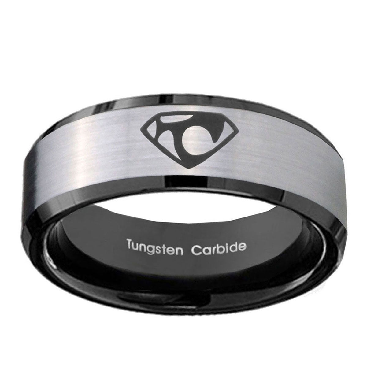 Celebrate with the 10mm House of Van Beveled Edges Brushed Silver Black Tungsten Wedding Band Mens. This silver and black tungsten ring with House of Van design is perfect for weddings.