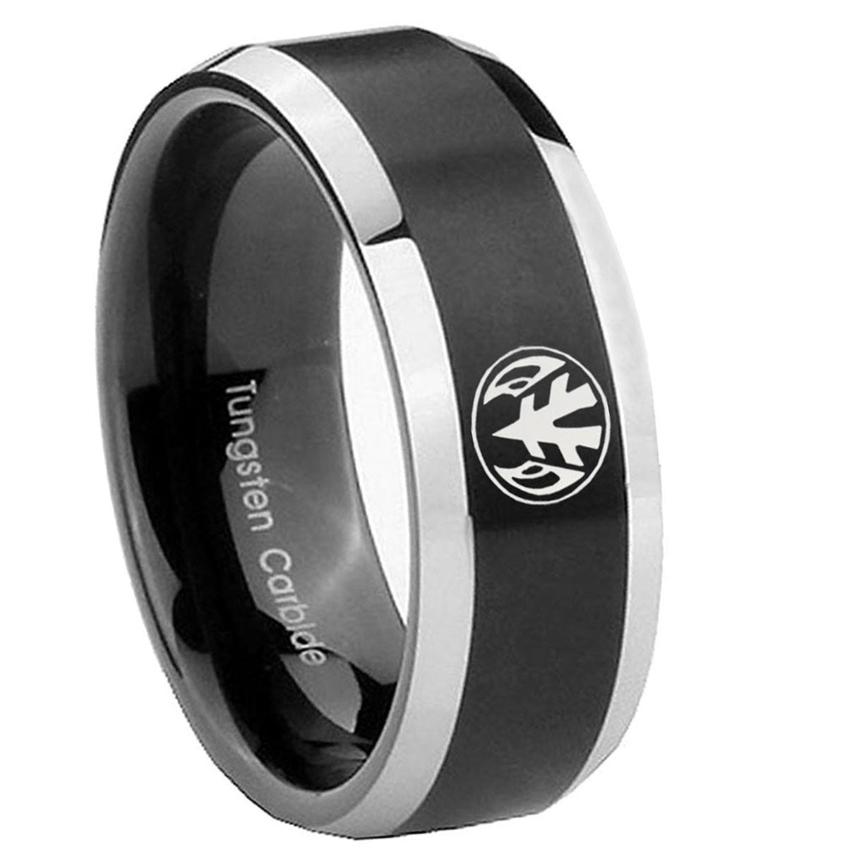 Style the 10mm Love Power Rangers Beveled Edges Brush Black 2 Tone Tungsten Rings for Men. This brushed black and 2-tone tungsten ring with Love Power Rangers design is perfect for men.