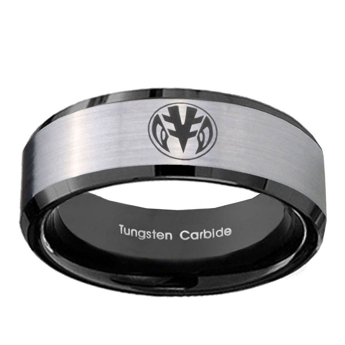 Celebrate milestones with the 10mm Love Power Rangers Beveled Brushed Silver Black Tungsten Anniversary Ring. This silver and black tungsten ring with Love Power Rangers design is perfect for anniversaries.