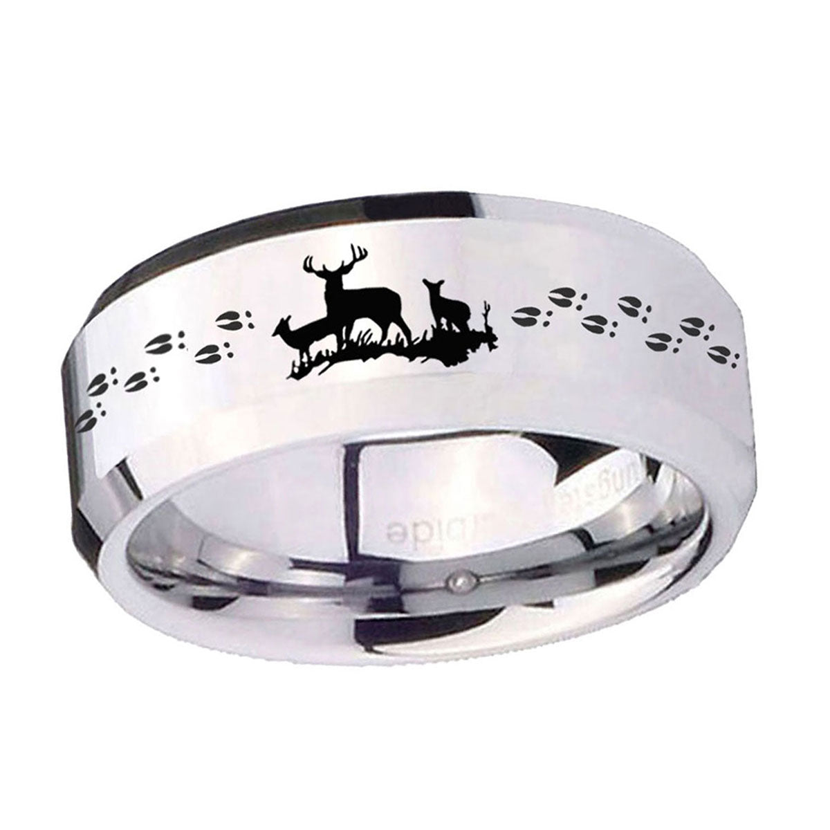 10mm Deer Hunting Beveled Edges Silver Tungsten Carbide Mens Ring Engraved