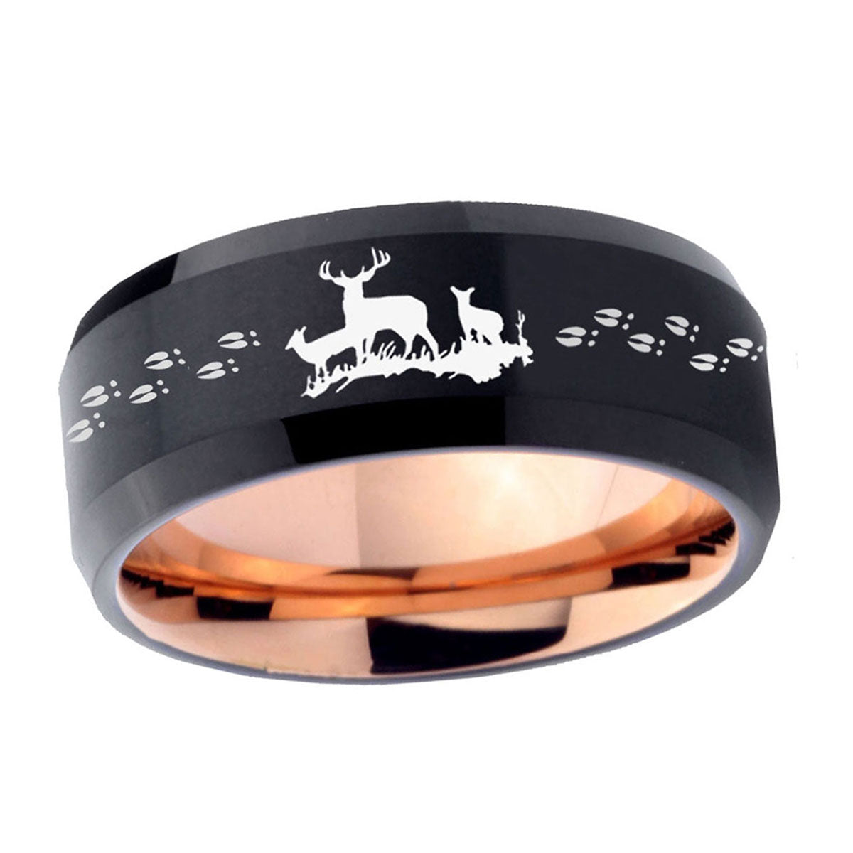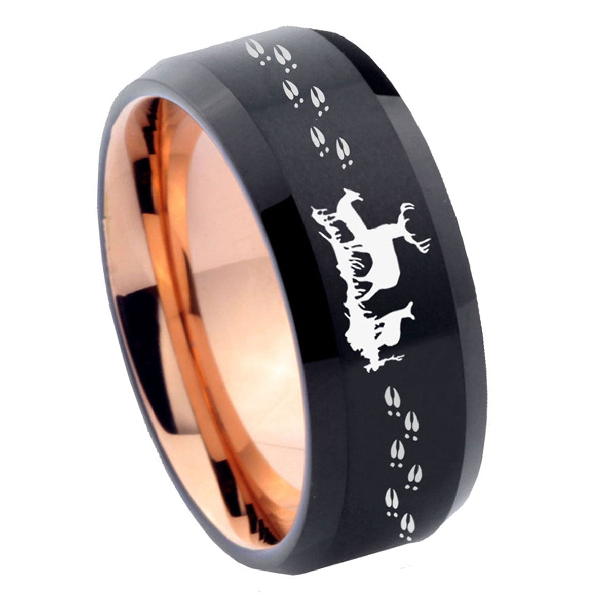 Add elegance with the 10mm Deer Hunting Bevel Tungsten Rose Gold Mens Wedding Band. This rose gold tungsten ring with Deer Hunting design is ideal for weddings.