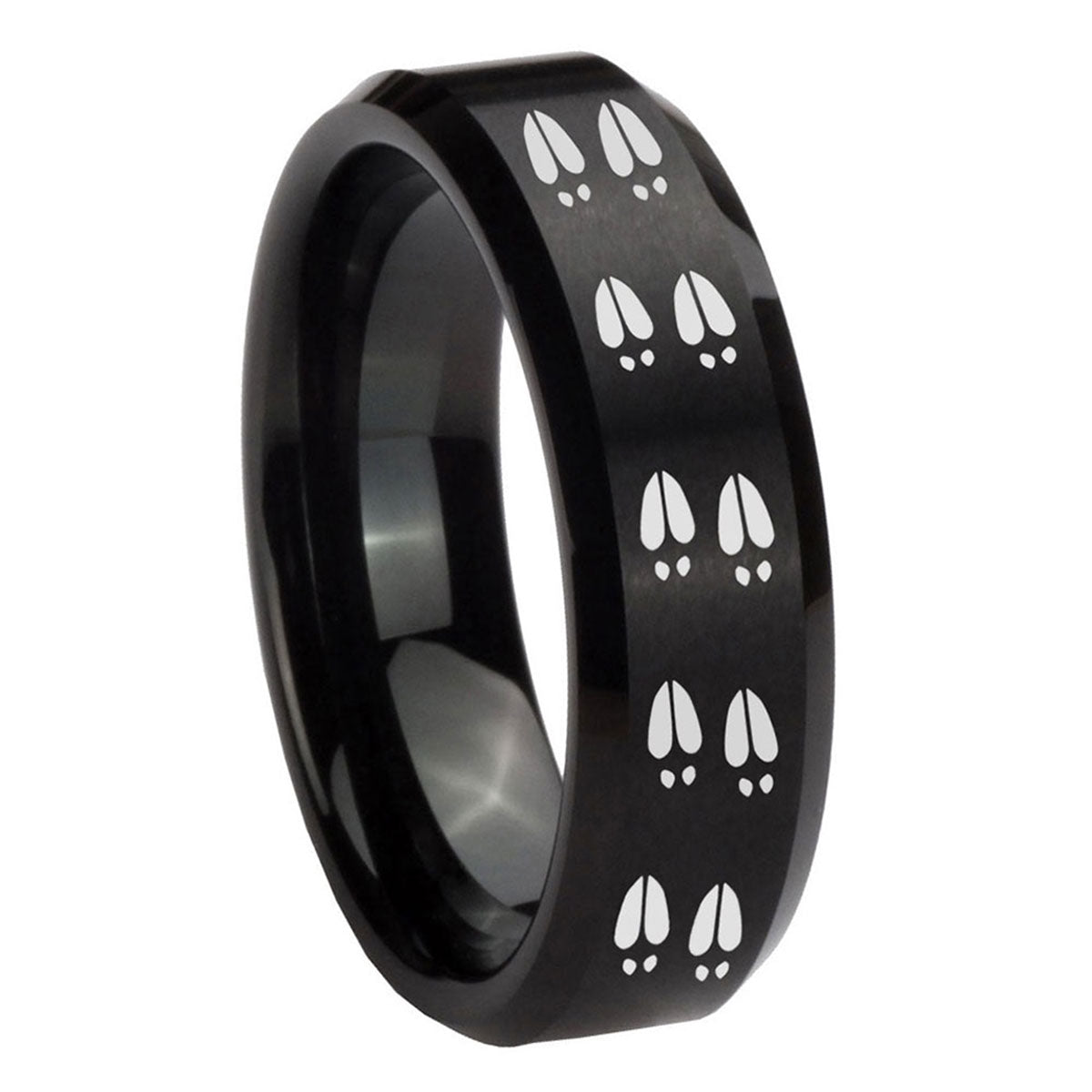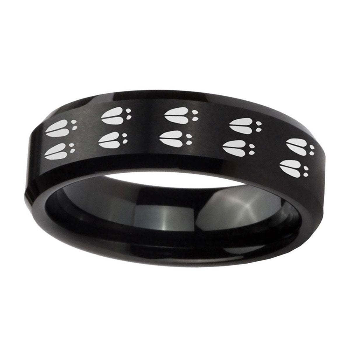 Propose with the 10mm Deer Tracks Beveled Edges Brush Black Tungsten Men's Engagement Band. This brushed black tungsten ring with Deer Tracks design is perfect for engagements.