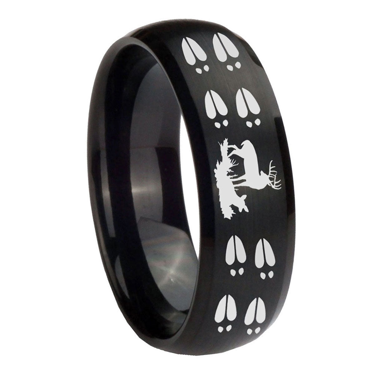 Celebrate with the 10mm Deer Hunting Tracks Dome Brush Black Tungsten Carbide Wedding Bands Ring. This brushed black dome ring with Deer Hunting Tracks design is perfect for weddings.