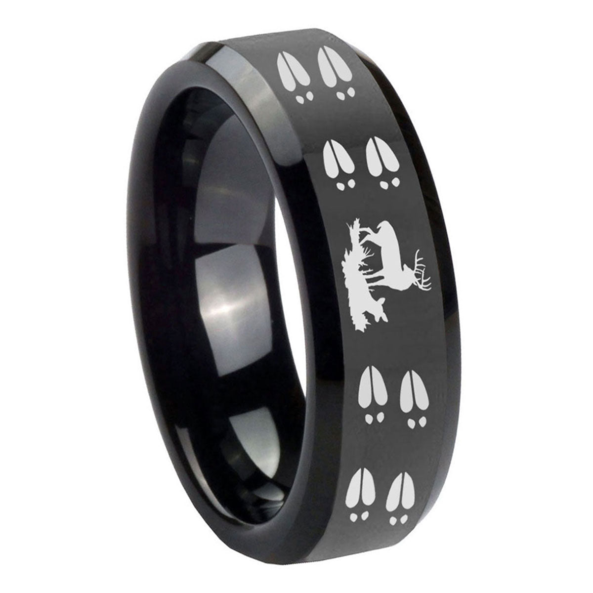 Style the 10mm Deer Hunting Tracks Beveled Edges Black Tungsten Carbide Men's Band Ring. This black tungsten ring with Deer Hunting Tracks design is perfect for men.