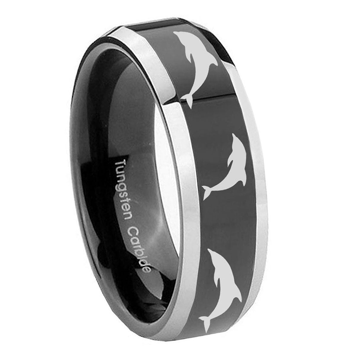 10mm Dolphins Beveled Edges Glossy Black 2 Tone Tungsten Carbide Engraved Ring