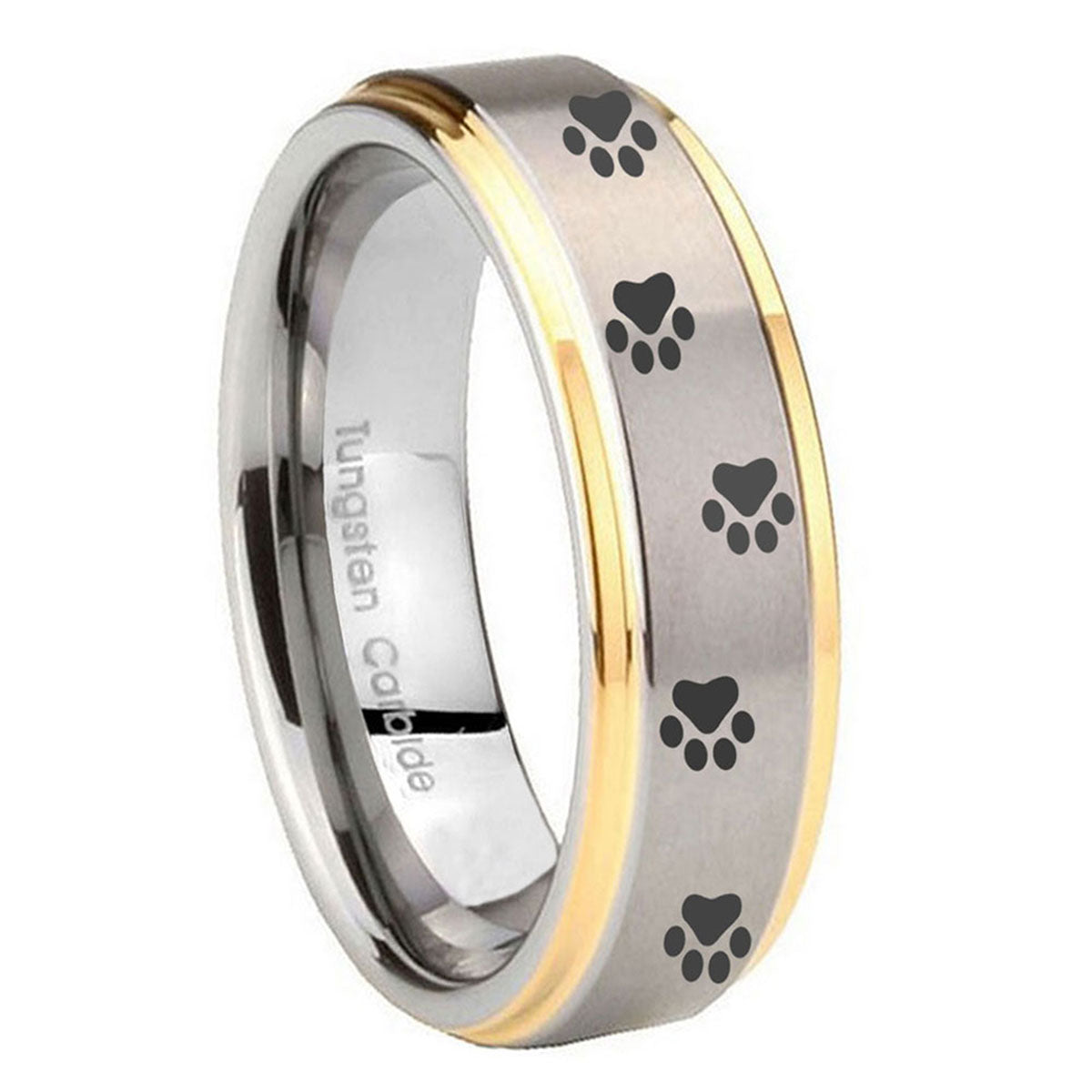 Customize the 10mm Paw Print Step Edges Gold 2 Tone Tungsten Carbide Custom Ring for Men. This gold and 2-tone tungsten ring with Paw Print design is perfect for personalization.