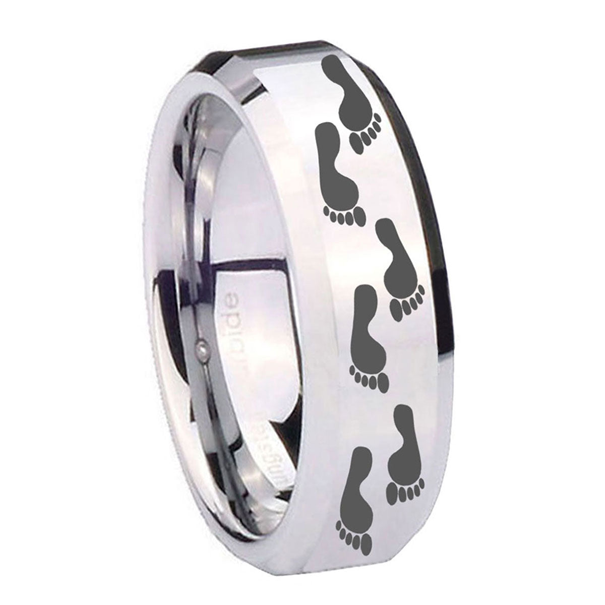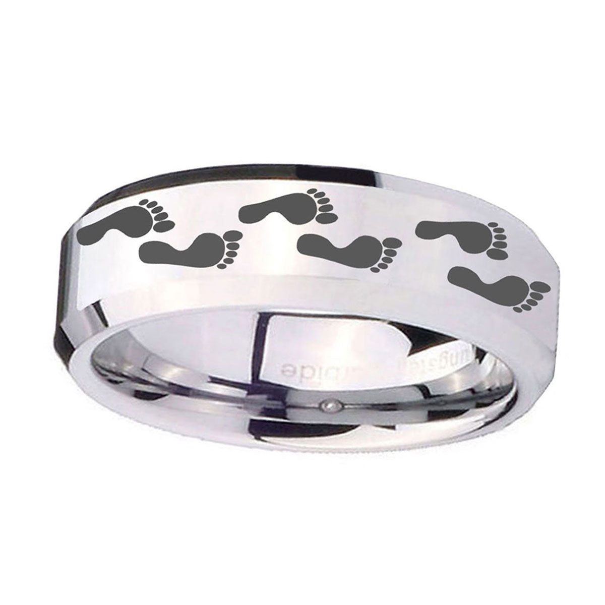 Celebrate milestones with the 10mm Foot Print Beveled Edges Silver Tungsten Carbide Mens Anniversary Ring. This silver tungsten ring with Foot Print design is perfect for anniversaries.