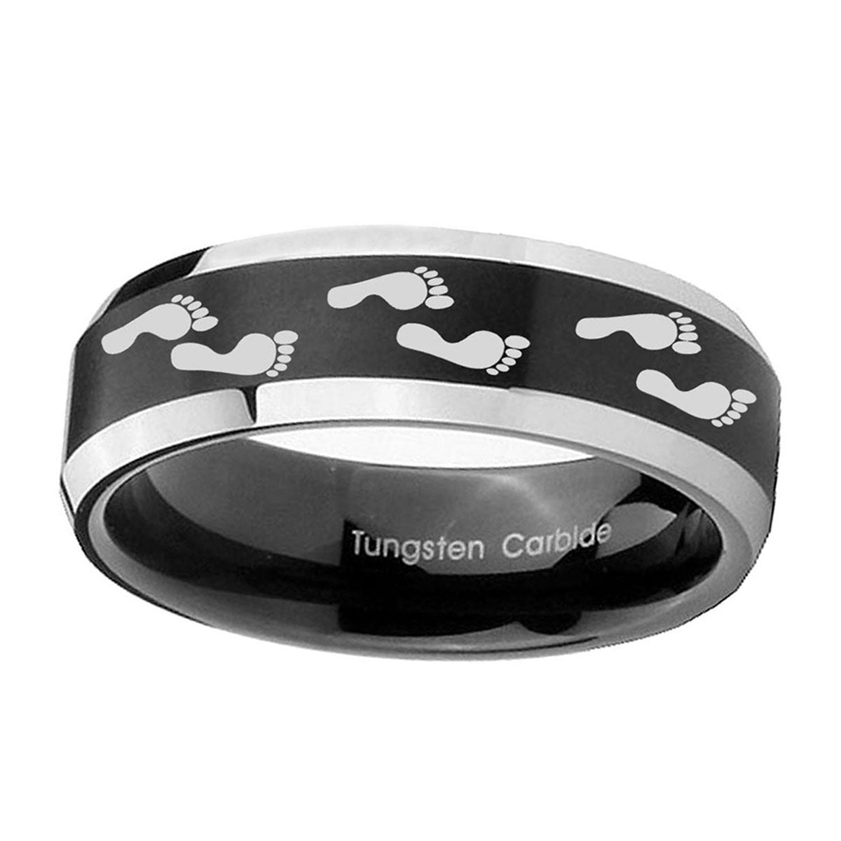 Celebrate with the 10mm Foot Print Beveled Edges Brush Black 2 Tone Tungsten Mens Wedding Ring. This brushed black and 2-tone tungsten ring with Foot Print design is perfect for weddings.