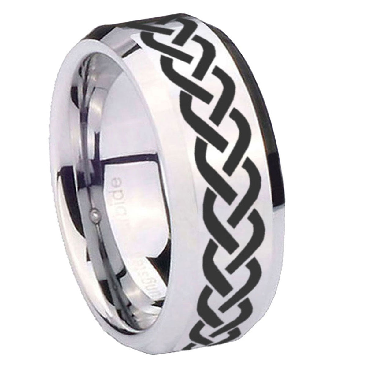 Personalize the 10mm Laser Celtic Knot Beveled Edges Silver Tungsten Carbide Mens Ring Engraved. This silver tungsten ring with Laser Celtic Knot design is perfect for custom engravings.