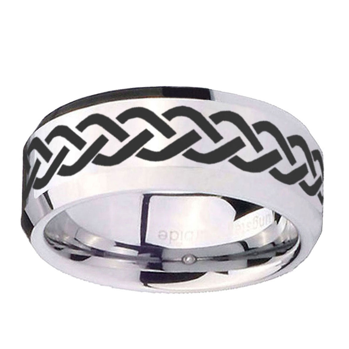10mm Laser Celtic Knot Beveled Edges Silver Tungsten Carbide Mens Ring Engraved
