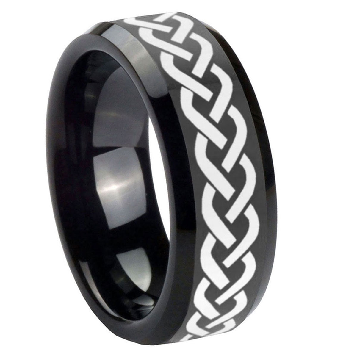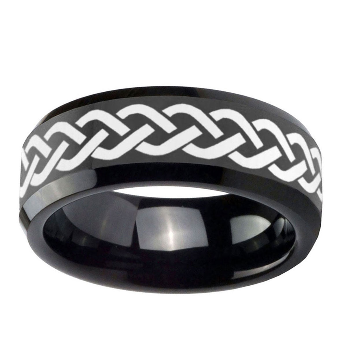 Celebrate with the 10mm Laser Celtic Knot Beveled Edges Black Tungsten Carbide Men's Wedding Band. This black tungsten ring with Laser Celtic Knot design is perfect for weddings.