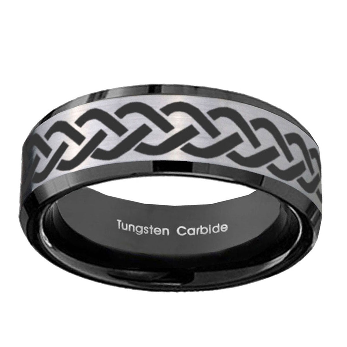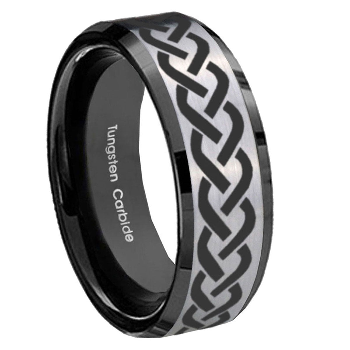 10mm Laser Celtic Knot Beveled Brushed Silver Black Tungsten Custom Mens Ring