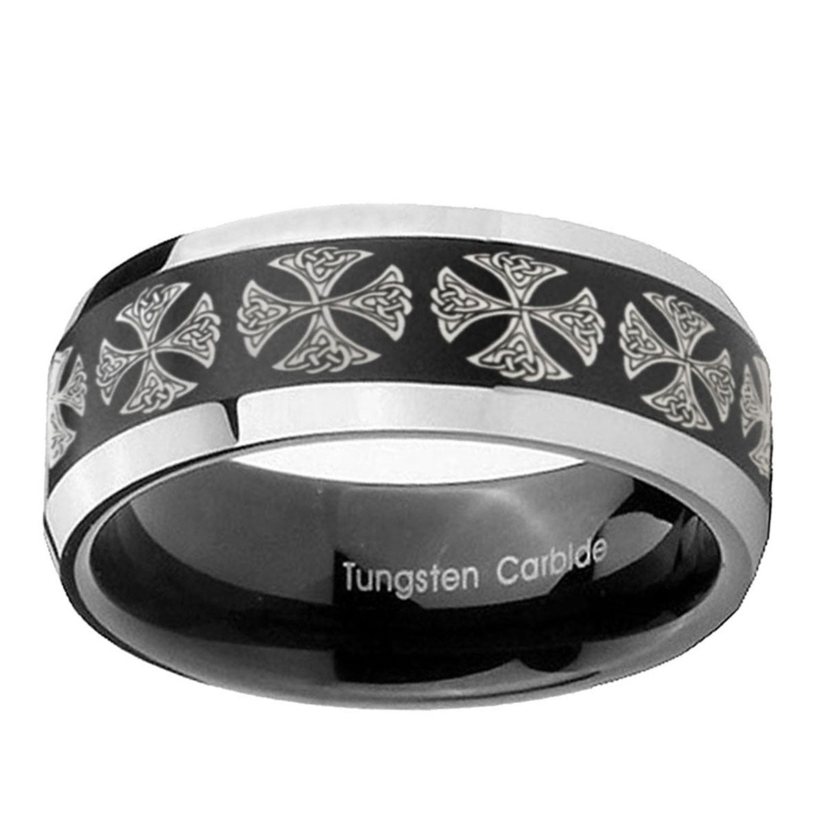 Personalize the 10mm Medieval Cross Beveled Brush Black 2 Tone Tungsten Mens Ring Engraved. This brushed black and 2-tone tungsten ring with Medieval Cross design is perfect for custom engravings.