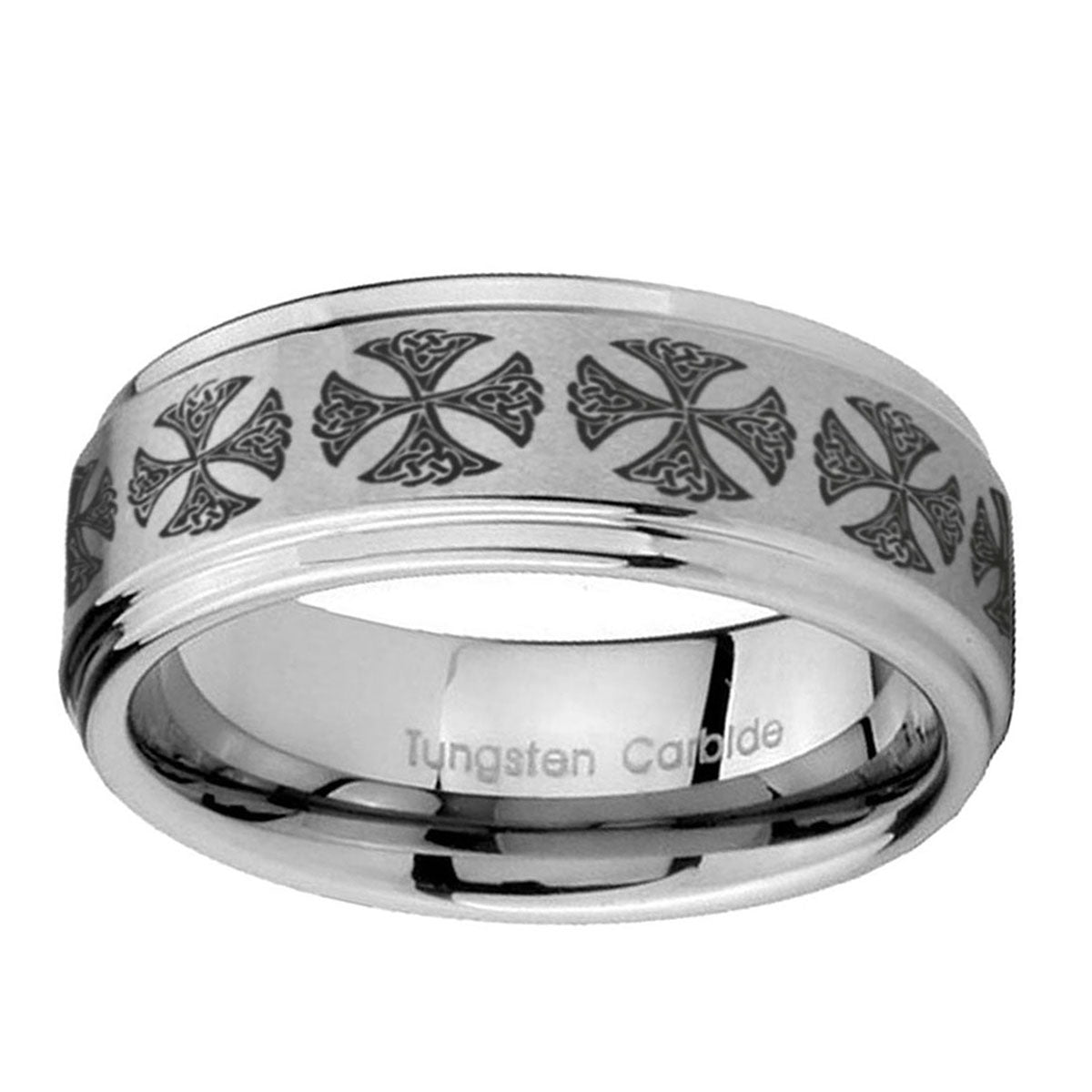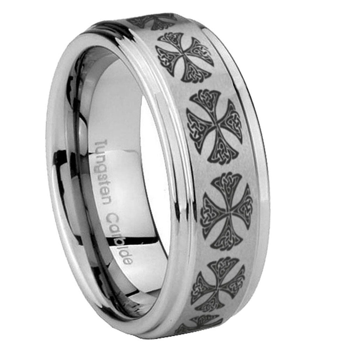 Celebrate with the 10mm Medieval Cross Step Edges Brushed Tungsten Carbide Men's Wedding Ring. This brushed tungsten ring with step edges and Medieval Cross design is perfect for weddings.