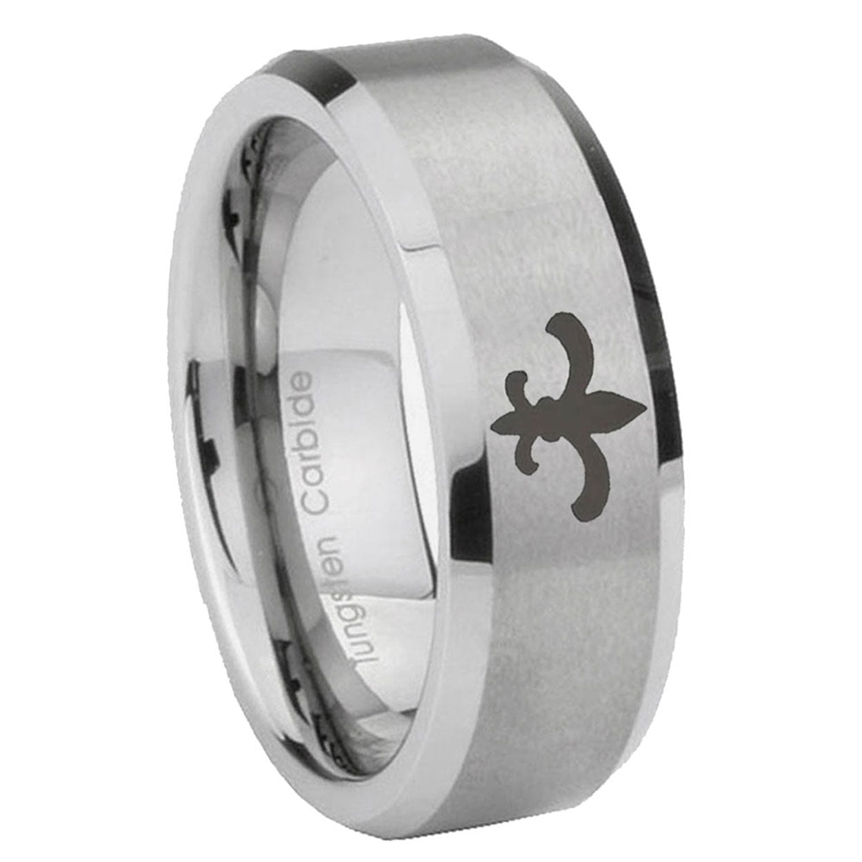 6, 8mm Fleur-De-Lis Beveled Edge Brushed Grey Tungsten Wedding Rings
