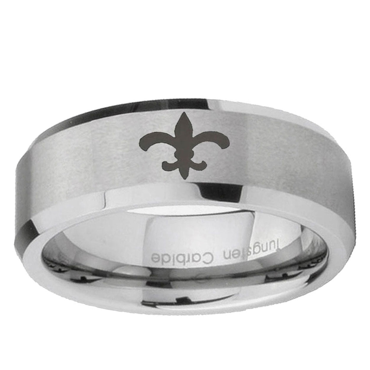 Introducing 6, 8mm Fleur-De-Lis Beveled Edge Brushed Grey Tungsten Wedding Rings . Offer in both 6mm and 8mm band width brushed grey finished from size 5 to 14