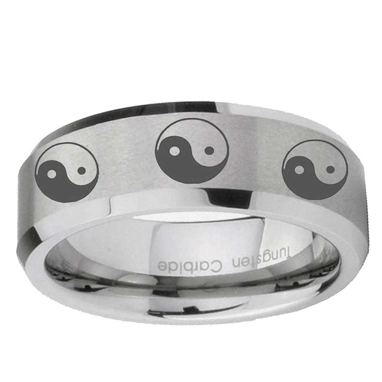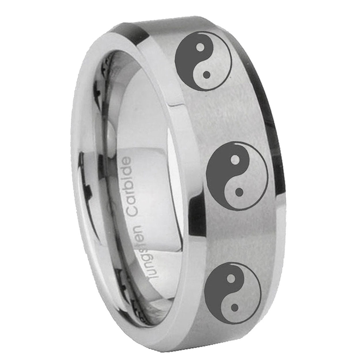 Intruding 6, 8mm Multiple Yin Yang Beveled Edges Brushed Gray Tungsten Carbide Mens Promise Ring . Offer in both 6mm and 8mm band width polished Brushed Gray finished from size 5 to 14